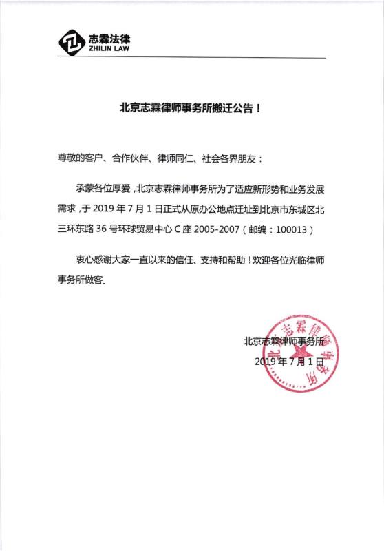 承蒙各位厚爱,北京志霖律师事务所为了适应新形势和业务发展需求,于2019年7月1日正式从原办公地点迁址到北京市东城区北三环东路36号环球贸易中心C座2005-2007(邮编:100013)。