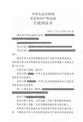 POSCO于2016年4月14日对新日铁的一项重要钢板专利提出无效宣告请求(我方代理),专利复审委员会2016年12月6日作出了宣布该专利全部无效的无效审查决定。新日铁不服上述无效决定,于2017年7月25日提出行政诉讼。