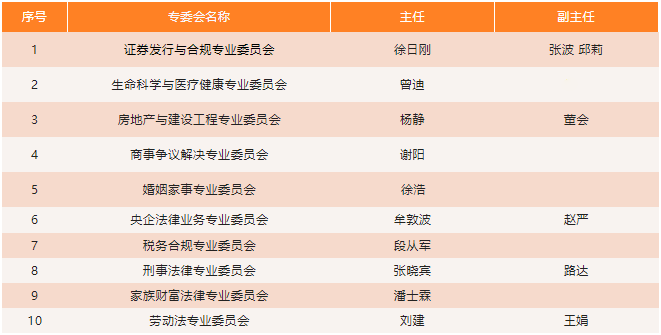 志霖现有10个专业委员会,分别是:证券发行与合规专业委员会,生命科学与医疗健康专业委员会、房地产与建设工程专业委员会、商事争议解决专业委员会、婚姻家事专业委员会、央企法律业务专业委员会、税务合规专业委员会、刑事法律专业委员会、家族财富法律专业委员会、劳动法专业委员会。