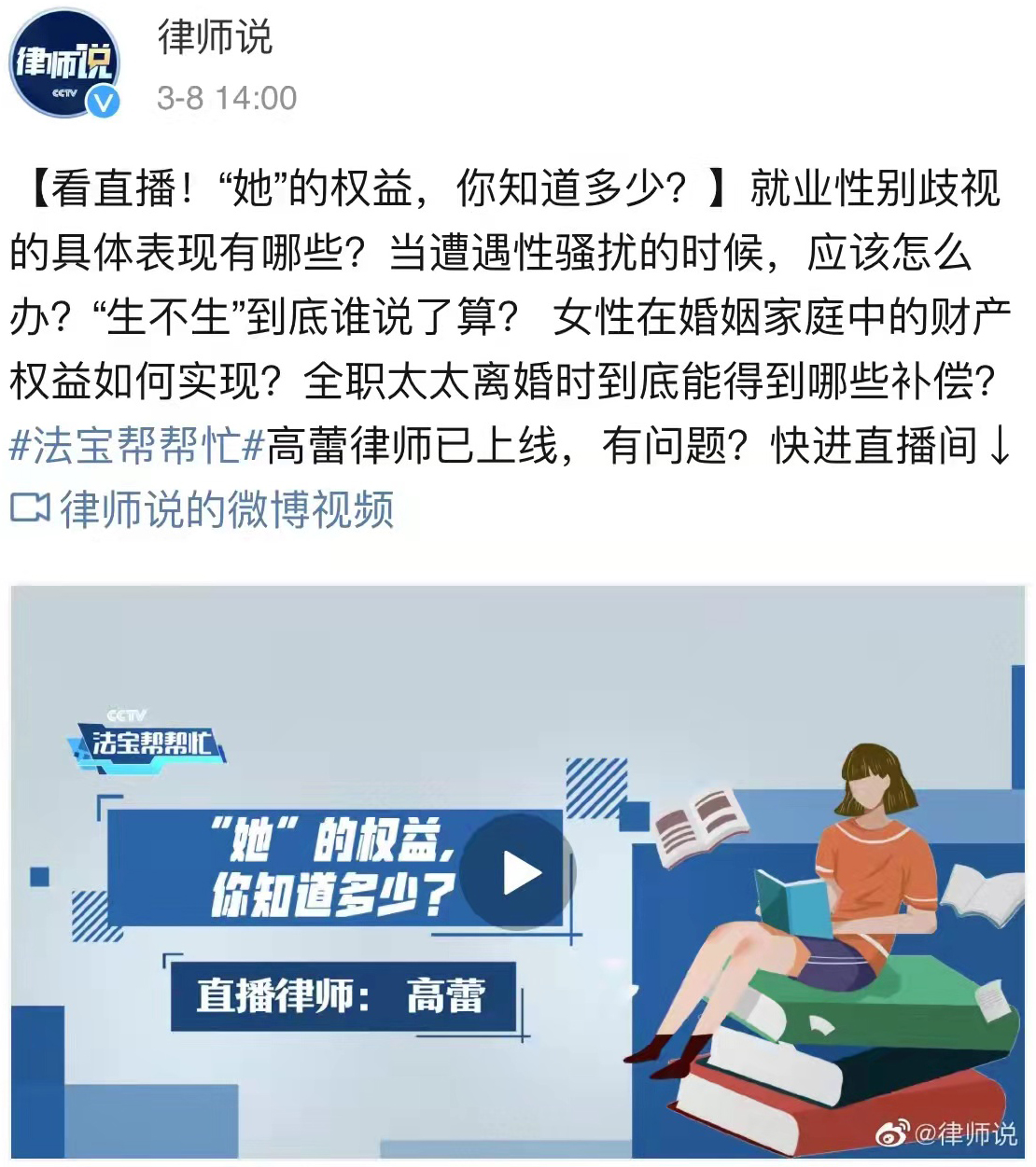 2022年3月8日下午,高蕾律师受中央电视台社会与法频道《法宝帮帮忙》节目邀请,以“‘她’的权益,你知道多少”为主题进行了直播公益讲座,就性骚扰、就业歧视、妇女生育自由、婚姻家庭中的财产权益等多个热点话题进行了生动的讲解,以案例为基础,以法律规定为核心,详述了妇女权益保障中的热点问题。
