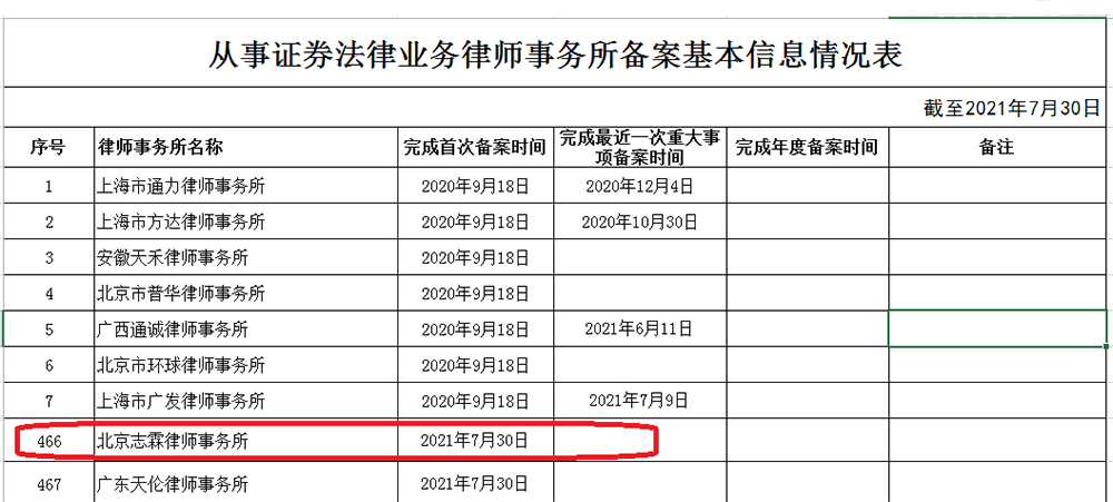 北京志霖律师事务所依据《证券法》、《备案规定》等法律法规的规定,按照要求向中国证监会提交了备案申请。2021年7月30日,根据中国证监会网站“律师事务所备案”栏目的公示名单,北京志霖律师事务所已成功完成中国证监会证券业务备案登记,成为可以从事证券法律业务的备案律师事务所。