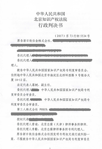 无效审查决定作出后,新日铁不服该决定提起行政诉讼,要求撤销该无效决定。志霖法律接受POSCO委托后,立即组成代理团队,对新日铁的起诉意见及证据进行深入分析,经过多次讨论,确定了诉讼策略,从涉案专利说明书中记载的解决技术问题的机理及权利要求的解释方面入手,一一反驳了对方的观点。最终,北京市知识产权法院作出(2017)京73行初5534号行政判决书,驳回了新日铁的诉讼请求,维持了无效决定。志霖法律为POSCO赢得了一审胜诉!