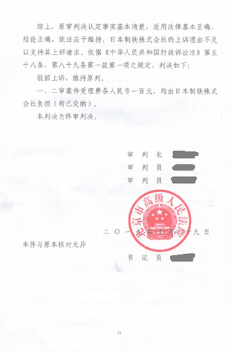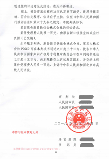 在一审判决作出后,新日铁不服该判决,于2018年末提起上诉。在接到新日铁的上诉状后,志霖律师团队针对其上诉理由认真研究诉讼策略,并在开庭审理时有理有据的反驳了对方的诉讼理由。最终,北京市高级人民法院作出(2019)京行终3275号行政判决书,驳回了上诉人的上诉请求。志霖法律为POSCO赢得了二审终审胜诉!