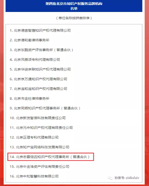 14日,北京志霖恒远知识产权代理事务所(普通合伙)成功入选第四批北京市知识产权服务品牌机构名单。