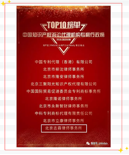 日前,北京志霖律师事务所再传捷报,志霖律所荣登“2018-2019年度中国知识产权诉讼代理机构专利行政榜TOP10”。