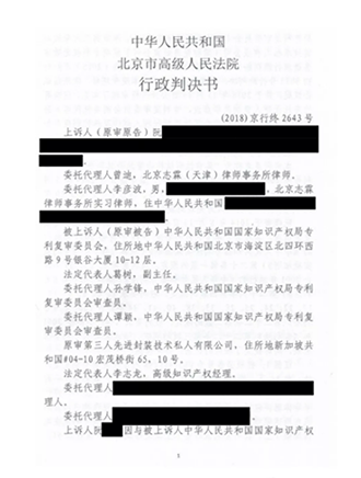2014年阮某(无效程序请求人)针对涉案专利权向专利复审委员会提出无效宣告请求,2015年初专利复审委员会作出无效决定维持涉案专利全部有效,阮某(一审原告)不服被诉无效决定,向北京知识产权法院提起行政诉讼请求撤销无效决定,2017年底北京知识产权法院判决驳回阮某的诉讼请求,2018年初阮某又向北京市高级人民法院提起上诉。在经历无效程序和行政诉讼一审两次失败后,当事人委托志霖法律代理行政二审。我所接受委托后,对本案高度重视,立即抽调办案经验丰富的律师和专利代理人组成专业团队,对无效程序和本案一审阶段的案件材料进行仔细研究,同时翻阅大量本领域相关技术资料了解相关技术背景、分析焦点技术特征,历经多次内部讨论和演练,理清应对策略和思路,并精心准备代理意见和庭审演示文稿,最终依靠专业的服务为客户赢得了胜诉结果!