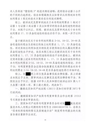 近日,志霖法律曾迪、李彦波律师代理的上诉人阮某在中华人民共和国北京市高级人民法院审理的专利无效行政诉讼二审案【案号为(2018)京行终2643号】中获胜。二审判决正确认定了专利和对比文件的技术事实,撤销了专利无效决定、撤销了一审判决。