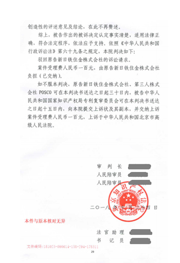 POSCO于2016年4月14日对新日铁的一项重要钢板专利提出无效宣告请求(我方代理),专利复审委员会2016年12月6日作出了宣布该专利全部无效的无效审查决定。新日铁不服上述无效决定,于2017年7月25日提出行政诉讼。