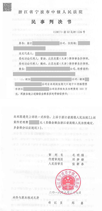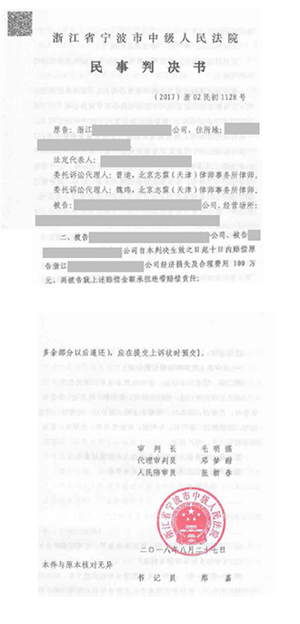 由于双方未能就赔偿数额等问题达成一致意见,志霖代理当事人向宁波市中级人民法院(下文简称“宁波中院”)提起民事诉讼。诉讼中,志霖律师对被诉侵权行为、技术特征比对及赔偿数额认定等几方面发表代理意见,最终宁波中院认定被告从事了被诉侵权行为,并且依法裁量三案赔偿额分别为100万元、60万元、100万元,有两案均按照法定赔偿自由裁量的顶额裁判,志霖法律为客户赢得了胜诉结果!